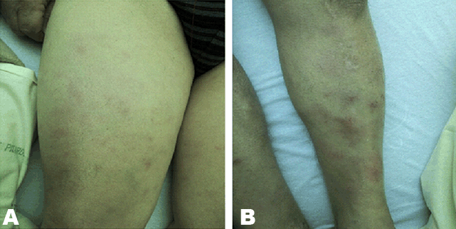 Figure 1: Dermatological lesions: well-circumscribed, indurated lesions on (A) Upper limbs and (B) Lower limbs.