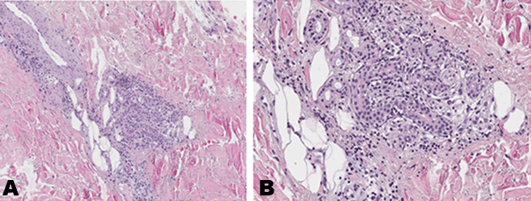 Punch biopsy of the skin revealed PNN-rich inflammatory dermal lesions surrounding apocrine (sweat) glands, which were consistent with NEH (Figure 2) (Figure 3). No vasculitis was observed. The epidermis was normal.