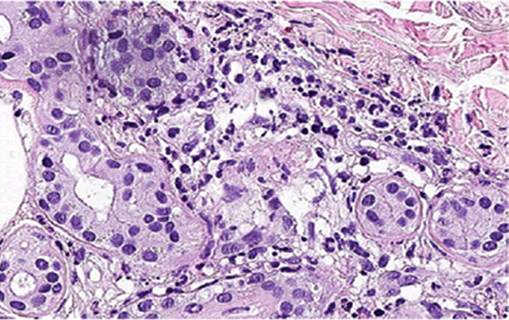 Figure 3: Neutrophils surrounding and infiltrating the sweat gland epithelium with gland atrophy (H&E stain, x400).