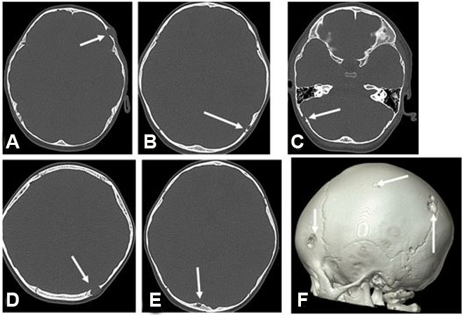 A previously healthy 2-year-old male presented with pneumonia. His workup revealed a bump on the left side of his head. He had no associated constitutional symptoms such as weight loss, fever, headaches, or seizures. He underwent imaging, including head and chest computed tomography (CT) and head magnetic resonance imaging (MRI). The latter revealed multiple ring-enhancing intra-axial lesions involving the gray-white matter junction of the bilateral frontal, left-sided parietal, left-sided occipital, and left-sided temporal lobes surrounded by significant vasogenic edema. The foci showed blooming artifact in the susceptibility weighted sequence (SWI) (Figure 1). The calvarium parietal bone showed the presence of multiple lytic intradiploic lesions associated with a soft tissue component (Figure 2). The skeletal survey did not reveal any lytic lesions. Abdominal ultrasound displayed an enlarged liver without focal lesions and no lymphadenopathy. The clinical considerations included inflammatory lesions, such as tuberculosis and fungal infection, and less likely multiple metastases. The patient is doing clinically well during follow-ups, and the MRI demonstrated improvements in intracranial lesions with no new parenchymal findings (Figure 1).
