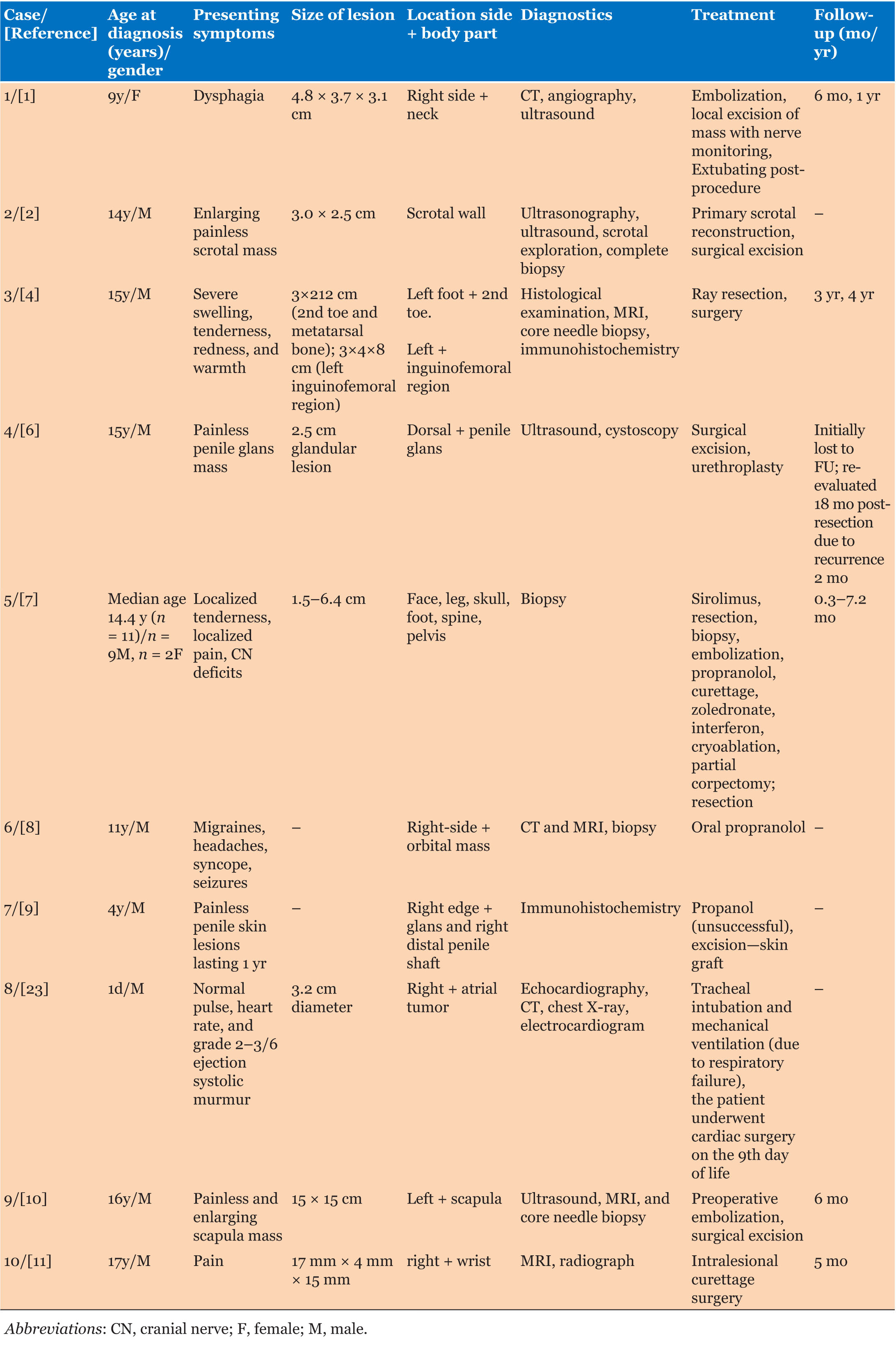 Wiggins CJ, Dibbs RP, Bartlett EL, Ashton DJ, Maricevich RS. Atypical presentation and management of an epithelioid hemangioma: A case report and review of the literature. Ann Pediatr Surg 2020;16(1):53. [CrossRef]