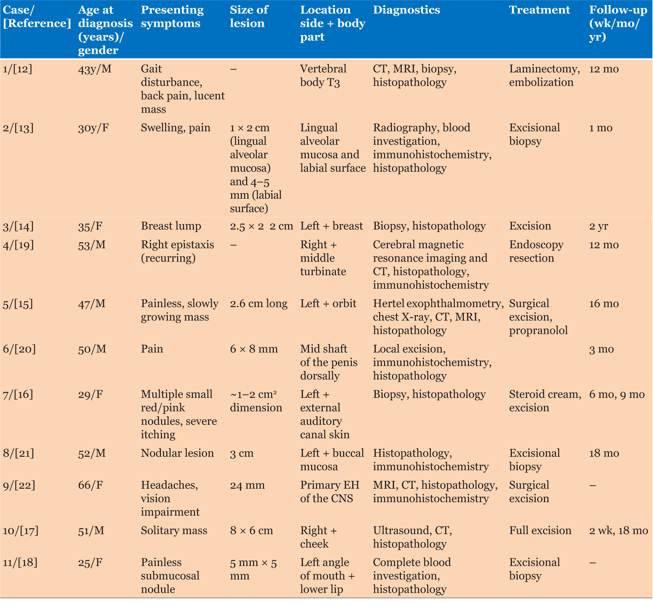 Epithelioid hemangioma is commonly seen in the head and neck region in both pediatric and adult populations [1],[2],[4],[6],[7],[8],[10],[14],[15],[16],[17],[18],[19],[20],[21],[22], aligning with our case presentation in the left frontal bone of the skull. However, the location of EH lesions can vary throughout the body [5],[7],[8],[10] (Table 1 and Table 2).