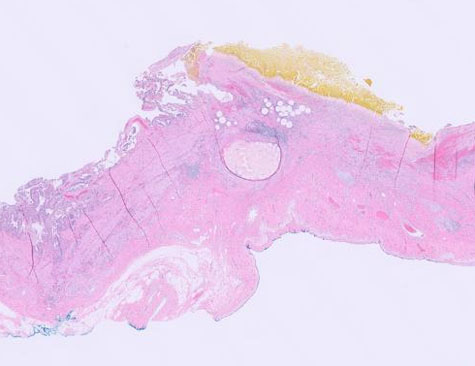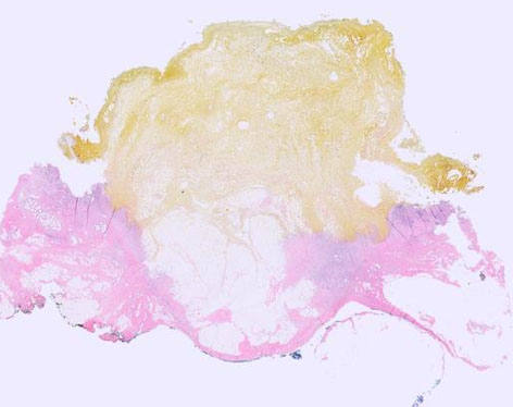 The patient had persistent disease identified on post-treatment imaging and was offered resection. Intraoperatively, the liver appeared to be cirrhotic with abdominal stigmata of portal hypertension. An abnormal appearance of the gallbladder infundibulum and neck was noted, a thick white appearance with a palpable mass. The gallbladder was resected and sent to the pathology unit for a frozen section to rule out metastatic disease. The palpable mass in the gallbladder which was noted to be consistent with a gall stone and the hard white area was consistent with chronic inflammation with embolic beads. Though there was suspicion of metastasis based on the gross appearance of the gallbladder, the final postoperative pathological diagnosis revealed cholelithiasis and chronic cholecystitis with chemoembolization beads with no carcinoma, as shown in Figure 1, Figure 2, Figure 3.