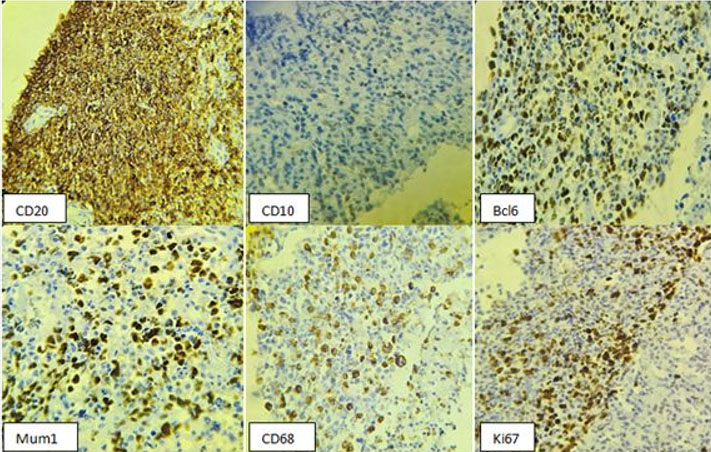 Histopathologically the World Health Organization classifies DLBCL as a tumor of medium to large B lymphoid cells with diffuse growth patterns. These cells’ nuclei are either more than twice as large as those of normal lymphocytes or are the same size as those of normal macrophages. Moreover, B-cell markers like CD19, CD20, CD22, CD79a, and PAX5 may be expressed by these cells [16],[17].