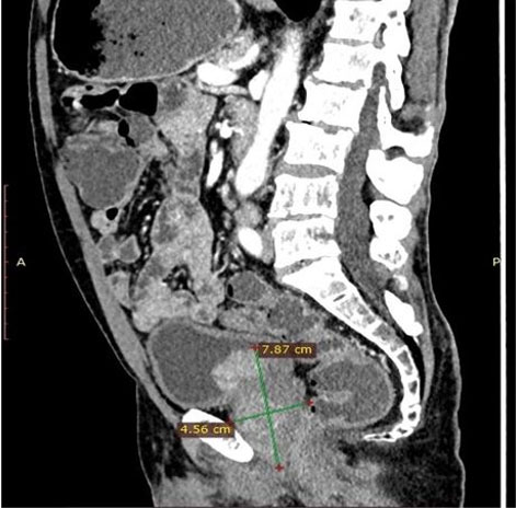 A 75-year-old male, African presented to the Uganda Cancer Institute (UCI), which is a tertiary cancer care facility in Uganda. The patient was a referral from a peripheral facility with a bladder mass, with a differential diagnosis of bladder cancer or prostate cancer given his age and presenting symptoms. Two months before referral, a partial transurethral resection of bladder tumor (TURBT) had been done, and the subsequent histology results were suggestive of fibrosarcoma, a diagnosis that was still queried by the primary clinician at the peripheral health facility. At UCI, the patient presented with a history of gross hematuria for one year, abdominal pain, dysuria, dribbling of urine, urgency and a feeling of incomplete voiding. A computed tomography scan of the pelvis done at UCI showed a residual tumor that was well-defined, and homogenous mass at the urinary bladder trigone, measuring 7.87 cm × 4.56 cm × 3.83 cm (Figure 1 and Figure 2). The mass appeared to originate from the posterior bladder wall and not extending beyond the bladder wall, no infiltration into the seminal vesicles, and no enlarged lymph nodes seen the gastrointestinal tract was free of any involvement by the mass as per the imaging findings.