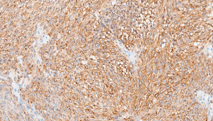 CD34 is a transmembrane glycoprotein widely used as an immunohistochemical marker to identify hematopoietic stem cells, vascular endothelial cells, and stromal fibroblasts, as well as various neoplasms, spindle cell tumors (e.g., dermatofibrosarcoma protuberans, solitary fibrous tumors), and gastrointestinal stromal tumors (GISTs) [9],[13],[14]. Various studies emphasize its utility in diagnosing solitary fibrous tumors (SFTs) and its variable expression in GISTs, where it is positive in up to 83% of the cases [15]. CKIT is expressed in 80–95% of GISTs, showing cytoplasmic and membranous immunostaining with a characteristic perinuclear dot-like pattern [5]. CKIT IHC helps differentiate GISTs from other soft tissue neoplasms that may stain positive with cd34 on IHC [16]. Tyrosine kinase inhibitors (TKIs), such as Imatinib, Sunitib, Regorafenib, and Ripretinib, are first-line therapies for KIT-mutant GISTs. The commonly used drug has been Imatinib, demonstrating very excellent response rate in patients with KIT mutated GISTs [17]. Additional markers like DOG1 improve diagnostic accuracy, particularly in CKIT-negative GISTs [18]. DOG1 (Discovered On GIST 1), also known as ANO1, is a calcium-activated chloride channel protein that serves as a highly sensitive and specific immunohistochemical marker for gastrointestinal stromal tumors (GISTs). It is expressed in approximately 95% of GISTs, including those lacking KIT or PDGFRA mutations, making it particularly useful for diagnosing KIT-negative cases [18]. Beyond GISTs, DOG1 is also expressed in normal tissues such as interstitial cells of Cajal, salivary gland acini, prostate basal cells, and kidney distal tubules, as well as in tumors like esophageal squamous cell carcinoma, salivary gland tumors, chondroblastoma [19],[20],[21]. This therefore suggests that DOG1 is only linked to a diagnosis of GIST in spindle cell tumors, with numerous differential diagnoses in DOG1 positive epithelioid neoplasms.