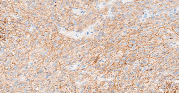 The formalin-fixed, paraffin-embedded (FFPE) tissue block from the previous biopsy was retrieved from the primary laboratory and then reviewed the histology at our facility, which revealed a tumor composed of spindle cells with fairly eosinophilic cytoplasm, inconspicuous nuclei, and rare abnormal mitoses (Figure 3). Immunohistochemically, the tumor cells were strongly positive for CD34 (Figure 4), CD117 (Figure 5), and DOG 1 (Figure 6).
