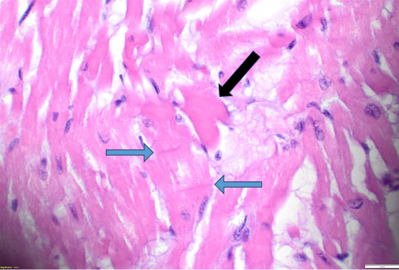 Histopathologic evaluation revealed scattered hypereosinophilic myocytes and contraction bands of the right and left ventricles (Figure 2 and Figure 3), consistent with global hypoperfusion, hypoxia, and catecholamine effect. No organisms were identified. No arteriosclerosis, fatty infiltration, dilated lymphatic vessels, or intercellular proteinaceous deposits existed.
