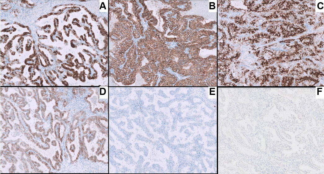 Histopathologically, the tumor shows predominance of clear cells with voluminous cytoplasm with unique histological findings, such as smooth muscle predominant fibrous pseudocapsule and fibromuscular bands more prominent at the periphery of the tumor, giving the tumor nodular to branched acinous or tubular architecture, and infrequently, focal papillary formations may be noted [4],[12]. However, due to clear cell morphology, these tumors share morphological homology with existing and novel entities like clear cell renal cell carcinoma (ccRCC), RCCs with fibromuscular stroma (RCCFMS), and clear cell papillary renal cell tumor (CCPRCT) [10] and are unanimously differentiated by subtle histopathological findings and two distinguished immunohistochemical stains, i.e., CAIX and KRT7. ELOC-mutated RCC bears a distinct immunohistochemical (IHC) profile characterized by a combination of clear-cell and non-clear-cell markers− box-shaped carbonic anhydrase IX labeling (CA IX), CD10+/KRT7+, AMACR+, epithelial membrane antigen (EMA+/–) (Figure 2, Table 1) [11]. In contrast, ccRCC exhibits diffuse membranous CAIX labeling, KRT7 focal/−, while CCPRCT shows cup shaped CAIX labeling, KRT7+, CD10−, EMA+/−, AMACR−, and reverse nuclear polarity with subnuclear vacuolation (Table 1) [12]. The fibromyomatous stroma seen in ELOC-mutated RCC often shows positivity for SMA and desmin.