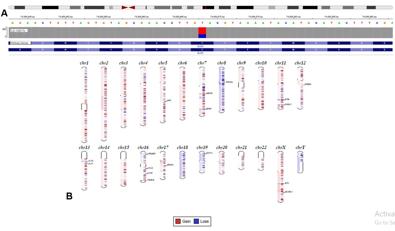 Immunohistochemistry showed tumor cell positivity for CD10, PAX8, alpha methylacyl CoA racemase (AMACR), AE1/AE3, and focal KRT7, with negativity for TFE3 and CD117 (Figure 2). Based on the above findings, a diagnosis of renal cell carcinoma with clear cell features was made. Next generation sequencing (NGS) was carried out using a 540-gene bait-probe-based assay on an Illumina 550 NextSeq with 300-cycle reagent kits (Illumina, San Diego, CA). The reagents used were IDT xGen gene capture probes (Integrated DNA Technologies, Inc., Coralville, IA) and KAPA HyperPrep Kit (Roche, Indianapolis, IN). Next generation sequencing detected a missense mutation at tyrosine 79 (Y79c), a hotspot codon of VHL-binding domain [7], representing a characteristic molecular signature mutation of ELOC-mutated RCC (Figure 3A). An EP300 inactivating variant was also detected, without mutations in VHL or other RCC-associated genes, and no TFE3 or TFEB fusions were identified [8]. Copy number analysis revealed loss of chromosome 8 sequences, including ELOC, without loss of the 3p chromosome (3p deletion is more characteristic of clear cell RCC, which helps differentiate from ELOC-mutated RCC). These observations were concordant with fluorescence in situ hybridization (FISH) results, which also did not show 3p deletion.