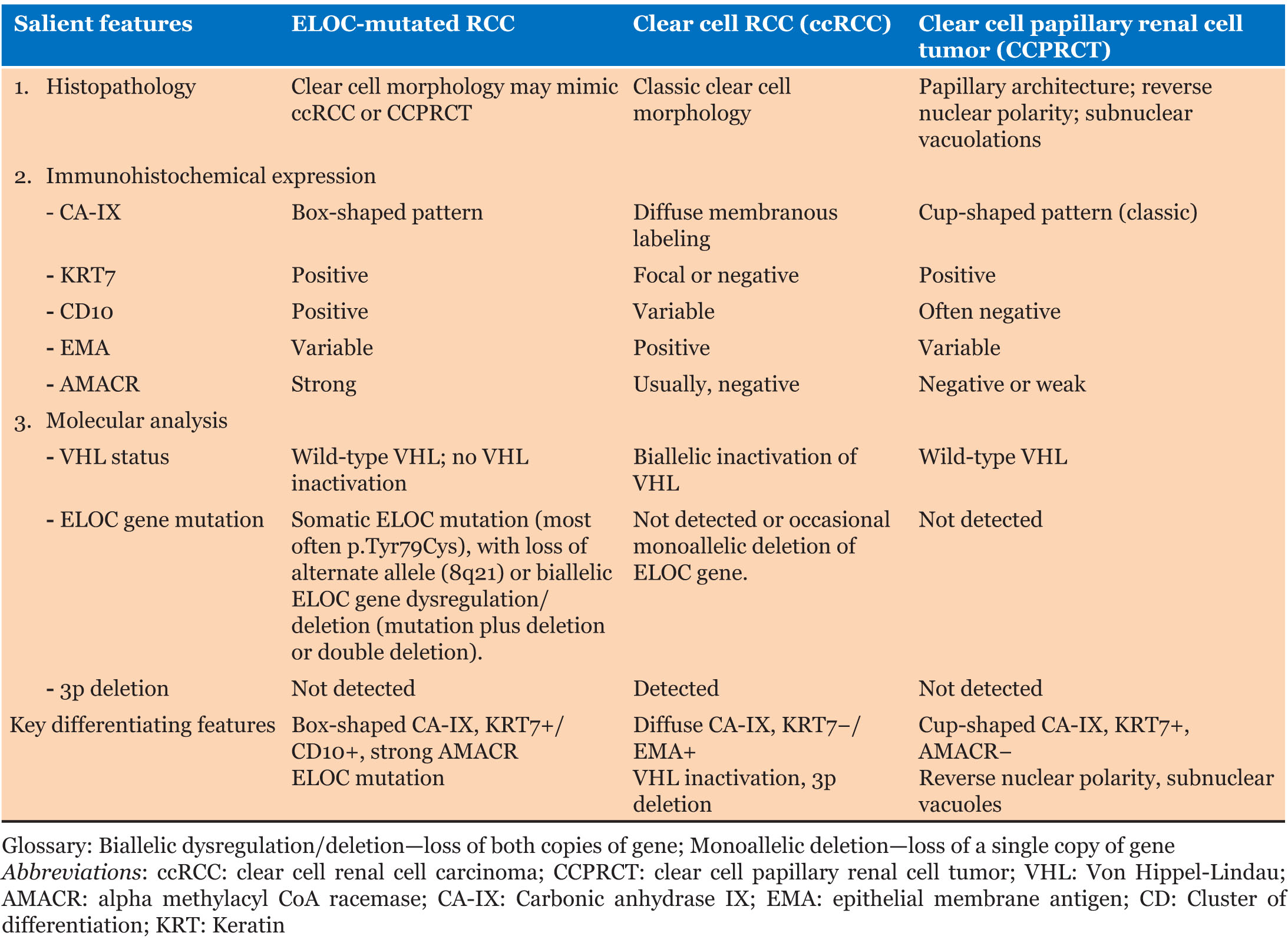 At molecular level, ELOC-mutated RCC display distinct wild-type VHL and somatic mutations in the TCEB1 gene, as well as loss of the alternate allele (8q21) [1], which contrasts with the biallelic inactivation of the VHL gene found in ccRCC (Table 1) [13].