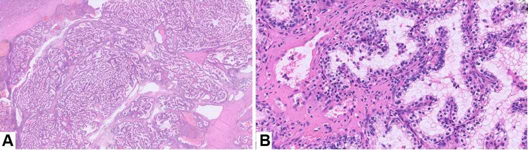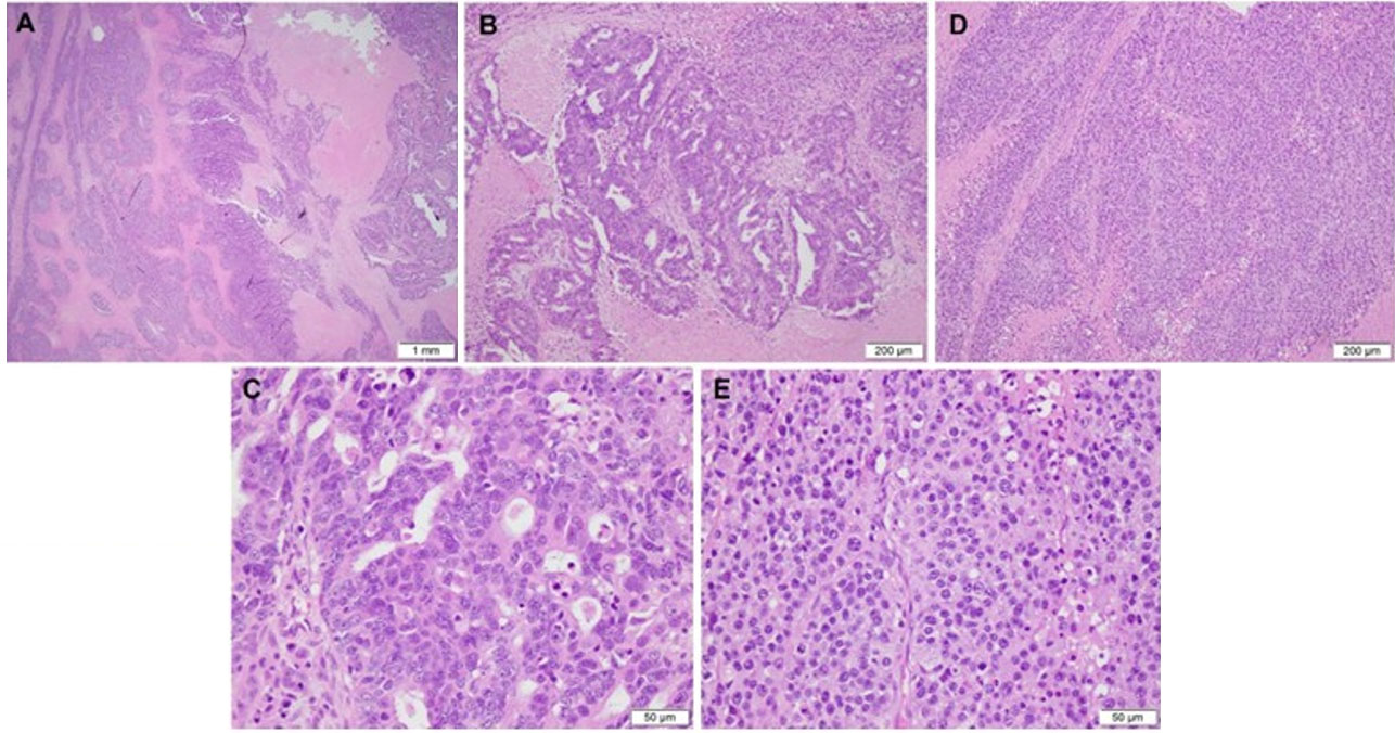 Microscopically, the lesion exhibited an infiltrative growth pattern (Figure 1A) and was composed of a component with predominant gland formation (Figure 1B and Figure 1C), along with a component consisting of solid sheets of poorly cohesive tumor cells intermixed with areas of necrosis (Figure 1D and Figure 1E). Tumor cells in both components demonstrated high nuclear grade and frequent mitotic activity (Figure 1C and Figure 1E).