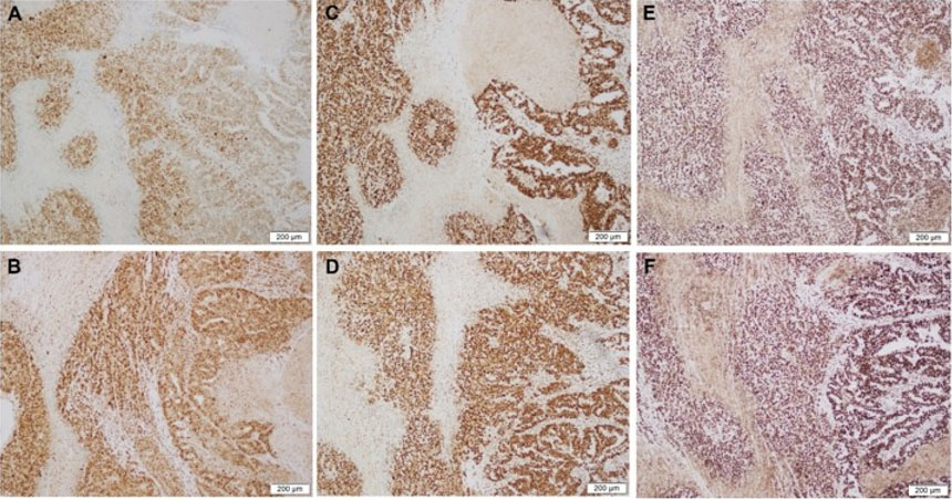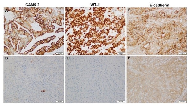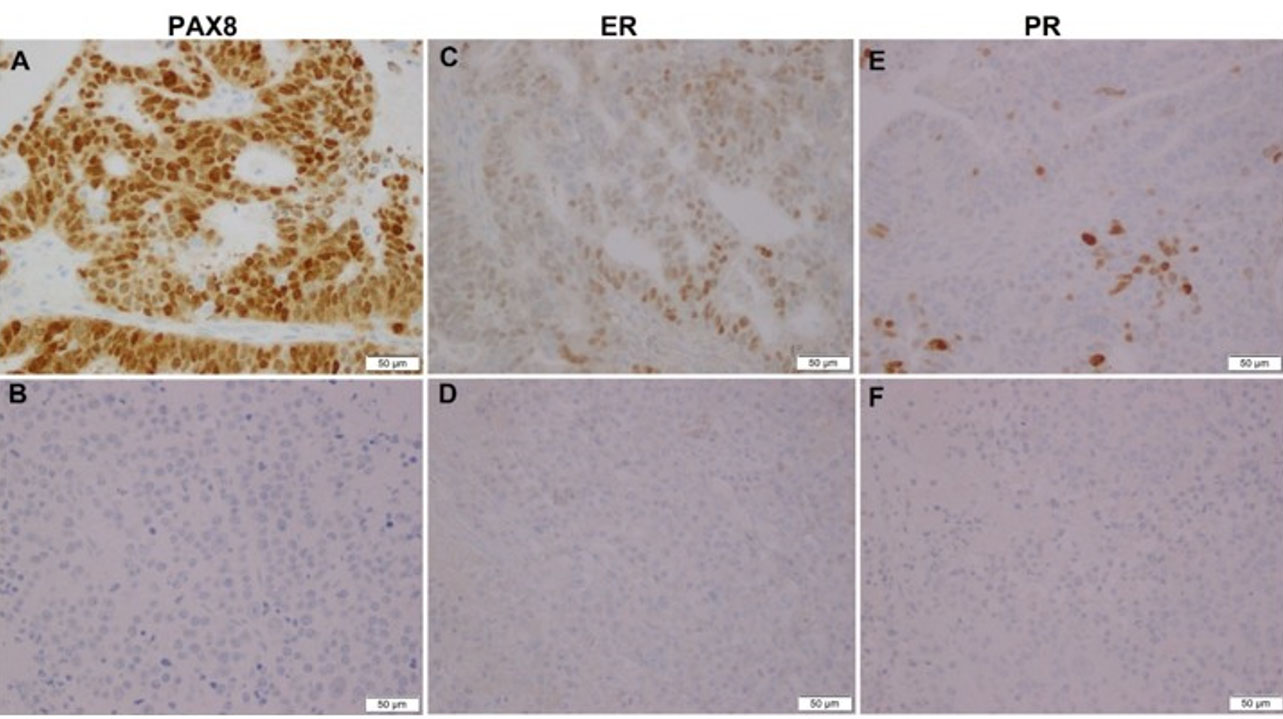 The glandular component showed diffuse nuclear expression of PAX8 (Figure 2A), patchy ER (Figure 2C), and PR (Figure 2E). In contrast, tumor cells within the solid sheets displayed complete loss of PAX8 (Figure 2B), ER (Figure 2D), and PR (Figure 2F). Diffuse expression of low molecular weight cytokeratin (CAM5.2) (Figure 3A), WT-1 (Figure 3C), and membranous E-cadherin (Figure 3E) was confined to the glandular component, whereas the tumor cells in the solid sheets showed only patchy CAM5.2 positivity (Figure 3B), absence of WT-1 nuclear staining (Figure 3D), and weak to no membranous E-cadherin expression (Figure 3F). Both components exhibited aberrant cytoplasmic p53 expression (Figure 4A and Figure 4B), diffuse nuclear and cytoplasmic p16 positivity (Figure 4C and Figure 4D), and a markedly elevated Ki-67 proliferation index (>95%) (Figure 4E and Figure 4F). The tumor cells in the solid sheets, but not in the glandular component, exhibited diffuse expression of two neuroendocrine markers: CD56 (Figure 5A and Figure 5B) and synaptophysin (Figure 5C and Figure 5D).