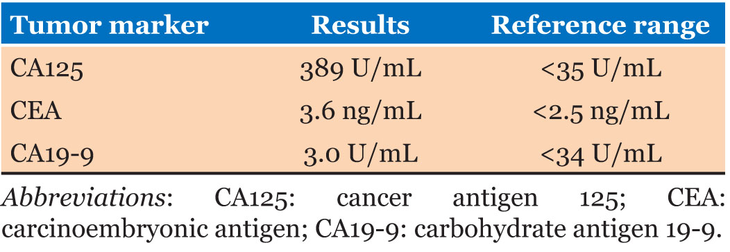 The patient is a 73-year-old female with a past medical history of osteoporosis, type II diabetes mellitus, hypothyroidism, and hypercholesterolemia, who presented with lower abdominal quadrant pain. The patient did not have abnormal vaginal bleeding or discharge, changes in bowel movements, or unintentional weight loss. There was no family history of gynecologic tract malignancy. Contrast-enhanced computed tomography (CT) imaging revealed a heterogeneous, enhancing pelvic mass that was inseparable from the uterus and extended toward the left of midline. The mass showed both cystic and solid components with irregular, enhancing internal septations, measuring approximately 8.1 × 8.5 cm on the axial dimension and 10.2 cm in the craniocaudal dimension. Serous tumor markers were notable for elevated cancer antigen 125 (CA125) and carcinoembryonic antigen (CEA), while carbohydrate antigen 19-9 (CA19-9) levels remained within normal limits (see Table 1).