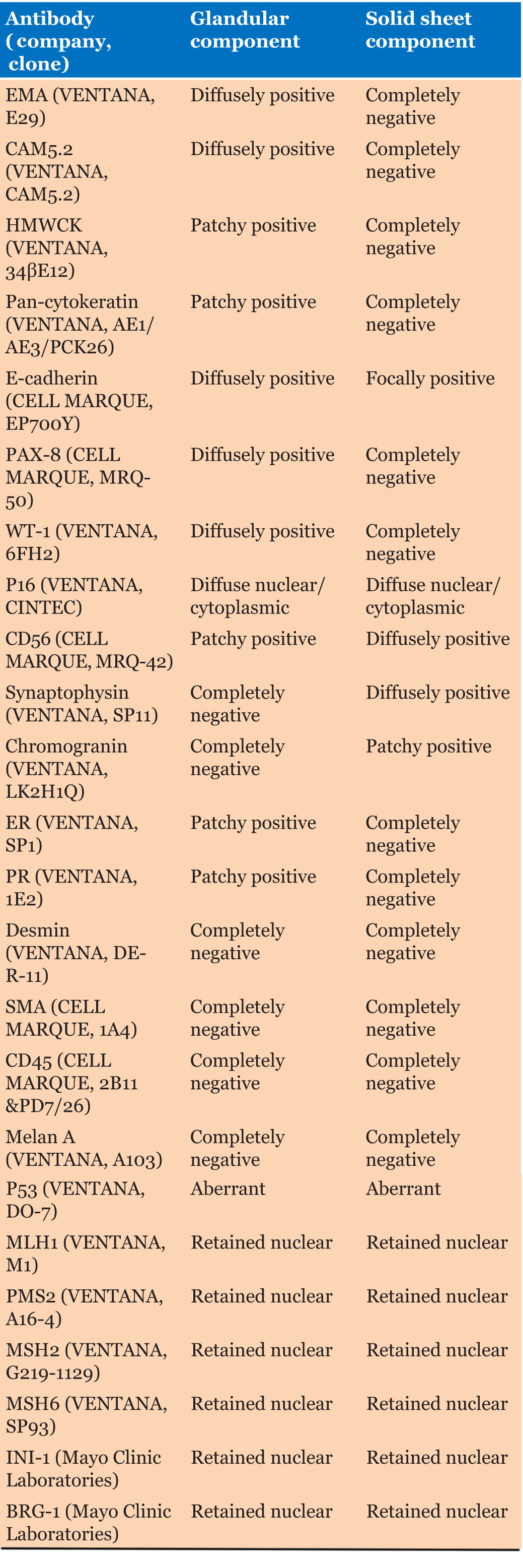 All immunohistochemical staining was performed at University Medical Center in New Orleans using standardized protocols and appropriate controls, except for INI-1 and BRG1, which were performed at the Mayo Clinic Laboratories (Rochester, MN). Detailed information on the antibodies used for immunohistochemical staining, along with the immunophenotypic profiles of the two components, is summarized in Table 2.